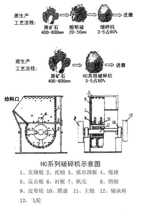 產(chǎn)品概述: HC高效節(jié)能破碎機(jī)是我公司工程技術(shù)人員經(jīng)過(guò)反復(fù)實(shí)踐與探索研制出的 種新型產(chǎn)品,它廣泛適用于石料廠。人工砂和水泥生料原料破碎,尤其適宜對(duì)石灰石、白云石、頁(yè)巖、石膏礦、熒石、煤矸石等中硬脆性物料,進(jìn)料粒度大、出料粒度小且均勻、并且可根據(jù)不同需要選擇和預(yù)定篩板,是礦山、水泥、建材企業(yè)比較理想的一級(jí)破碎設(shè)備。改寫(xiě)了水泥生料設(shè)備工藝并減少1/3的設(shè)備投資和節(jié)省1/2的電耗,省去了大量的維修費(fèi)用。